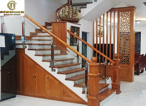 Lan can cầu thang gỗ kết hợp kính cường lực đơn giản bắt mắt